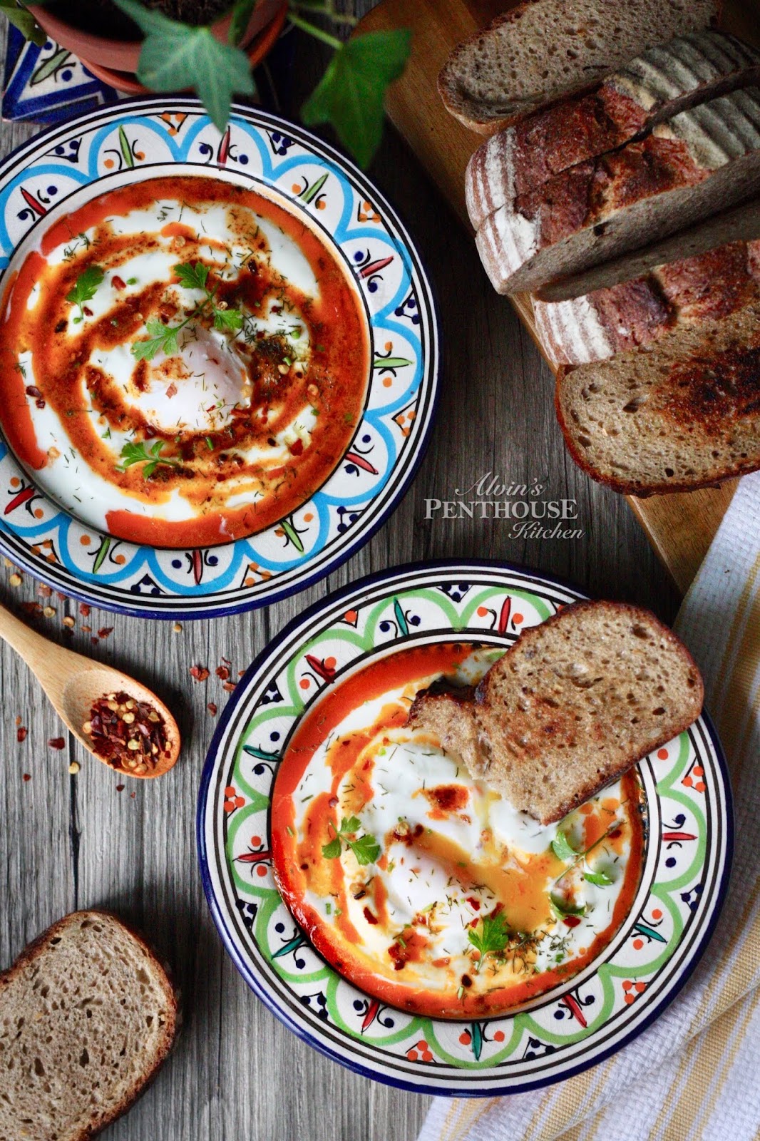 4. 把乳酪平均分配到兩個碗子裡後各放上一隻水波蛋。淋上辣椒牛油,再撒上刁草和乾辣椒碎,最後拌上厚切酸種麵包吐司即成!
